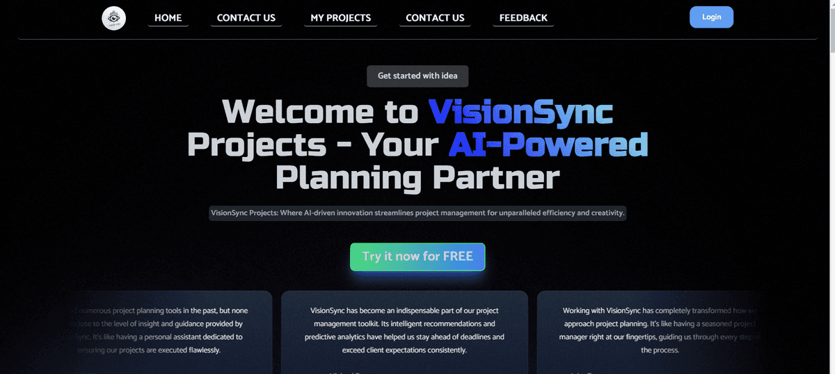VisionSync is an innovative platform that leverages artificial intelligence to generate unique project ideas and streamline the project planning process, making it easier for individuals and teams to kickstart their projects efficiently and creatively.